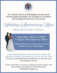 The Catholic Church of Philadelphia warmly invites married couples throughout our archdiocese to celebrate their wedding anniversary at the annual Wedding Anniversary Mass on Saturday, May 2nd at 5:15pm at the Cathedral Basilica of Sts. Peter & Paul in Philadelphia.